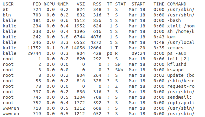The STAT field shows what state the process is in. If the shell is suspended, this field shows an S. In the example 2, an Emacs editing session is running, but it's suspended using Ctrl-Z. This is shown by the T in its STAT field. The last process shown for user kalle is the ps that is generating all this input; its state, of course, is R because it is running.